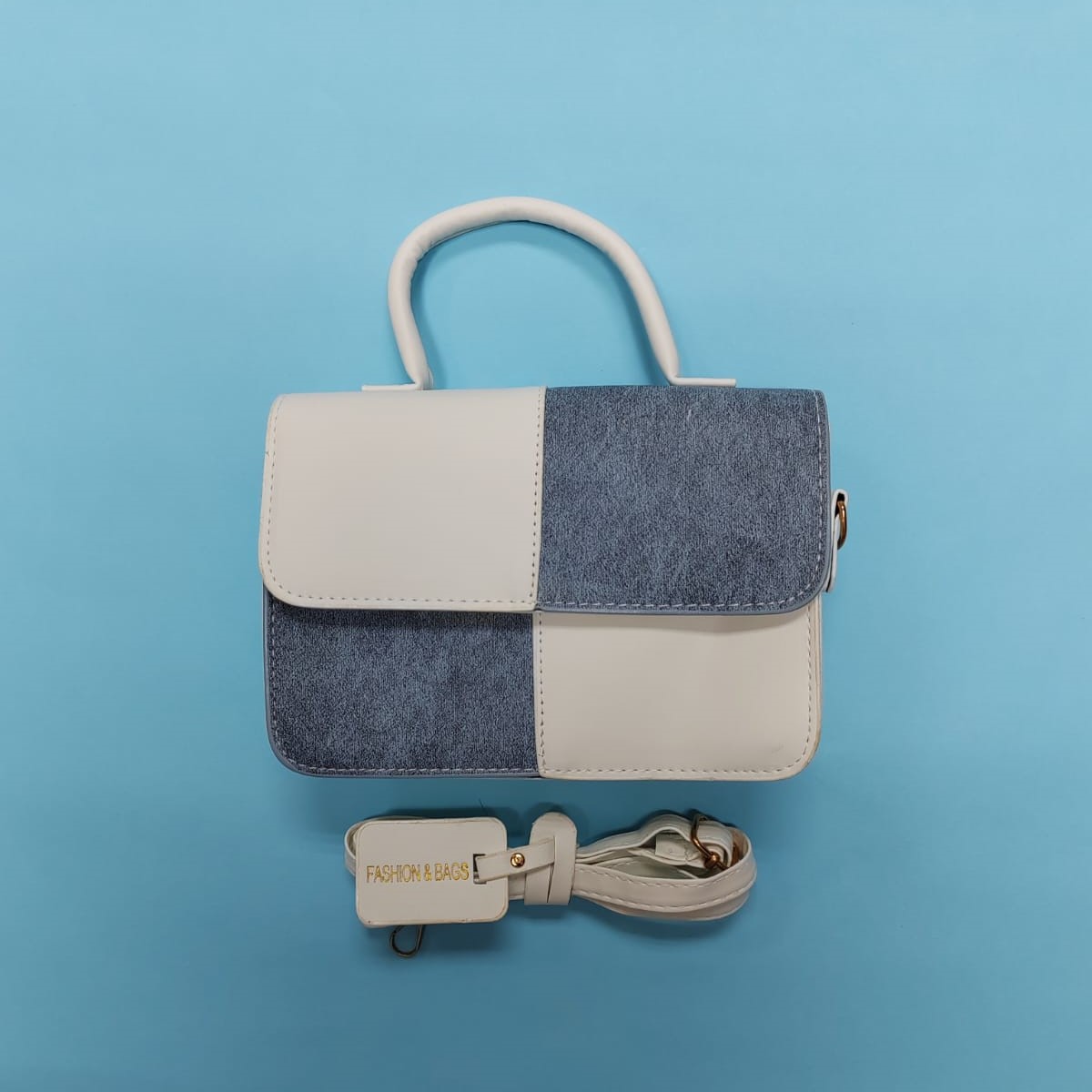 拼接撞色單肩手提/斜帶手袋 – 白配藍